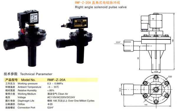 一、RMF-Z-20A-EX脈沖閥 電磁脈沖閥是脈沖袋式除塵設(shè)備中在低壓氣源壓力條件下使用的雙膜片快速脈沖閥。受脈沖噴吹控制儀輸出信號(hào)的控制,對(duì)濾袋逐排噴吹清灰,使除塵器的阻力保持在設(shè)定的范圍內(nèi),以保證除塵器的處理能力和收塵效率。 電磁脈沖閥 為直角式脈