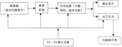 本控制儀由雙時(shí)基電路CH7556的1/2作為無(wú)穩(wěn)態(tài)多諧振蕩器產(chǎn)生周期為1~99秒的可調(diào)脈沖信號(hào);另1/2作為單穩(wěn)態(tài)電路完成計(jì)數(shù)、譯碼、脈沖分配等一系列邏輯功能,再由專用電路的各輸出端輸出所設(shè)定的脈沖寬度信號(hào)至電子開關(guān)(VMOS電路),控制電磁脈沖閥的開啟,噴吹壓縮空氣,同時(shí)由數(shù)碼管顯示噴吹順序。