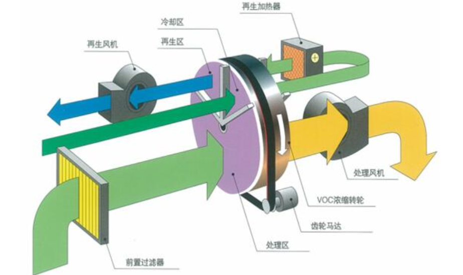 沸石轉(zhuǎn)輪吸附濃縮裝置是轉(zhuǎn)輪在處理區(qū)-再生區(qū)-冷卻區(qū)三區(qū)連續(xù)變溫運轉(zhuǎn),把低濃度、大風(fēng)量的有機廢氣濃縮為高濃度、小風(fēng)量的有機廢氣。其裝置特性適合處理大流量、低濃度、含多種有機成分的