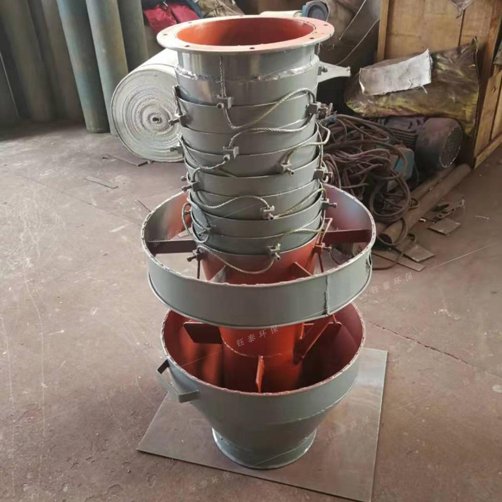 制作外伸縮布袋方式:要求伸縮布袋上每2個相鄰漲圈之間的垂直間距必須≤10cm,見圖1。當(dāng)外伸縮布袋折疊后2個相鄰漲圈之間的布袋向內(nèi)褶皺時,不能阻擋住與內(nèi)直鋼套筒外壁之間形成的環(huán)形負(fù)壓吸塵通道的橫截面,從而降低負(fù)壓吸塵的通過量。客戶使用現(xiàn)場反饋漲圈間距大的吸塵氣流明顯比漲圈間距小的吸塵氣流更加順暢。