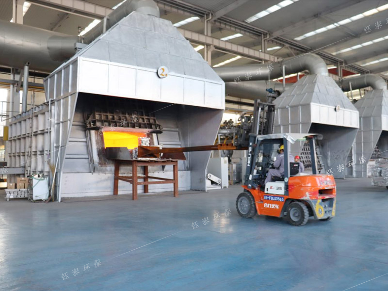 再生鋁雙室爐煙氣處理系統(tǒng)采用XLP高效旋風(fēng)除塵器+強(qiáng)制排風(fēng)冷卻器+脈沖布袋除塵器組成,雙室爐爐門排煙采用2個(gè)排煙罩,2個(gè)爐門罩交替打開;并配套爐膛排料輔助排煙系統(tǒng),1套雙室爐煙氣處理系統(tǒng)處理風(fēng)量≥130000m3/h。除塵器運(yùn)行后將雙室爐燃燒過(guò)程產(chǎn)生的高溫?zé)煔猓囟龋?50℃)和爐門罩排出的煙氣全部收集干凈,保證了工人的操作環(huán)境,達(dá)到了規(guī)定的排放標(biāo)準(zhǔn),給生產(chǎn)企業(yè)帶來(lái)了巨大的經(jīng)濟(jì)效益。除塵器收集的顆粒污染物主要是熔煉過(guò)程中產(chǎn)生的金屬氧化物和非金屬氧化物,還有大量碳?;曳莸?,除塵脫硫后:煙塵濃度:≤10mg/m3。